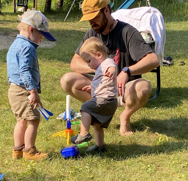 Robbie is showing Fletcher how to stomp on the rocket and then Fletcher gives it a try.